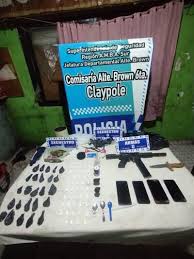 Además, fueron incautados 50 envoltorios con cocaína y 25 de marihuana listos para su comercialización, además de un arma de fabricación casera similar a una ametralladora, cuatro celulares y elementos de corte y fraccionamiento.