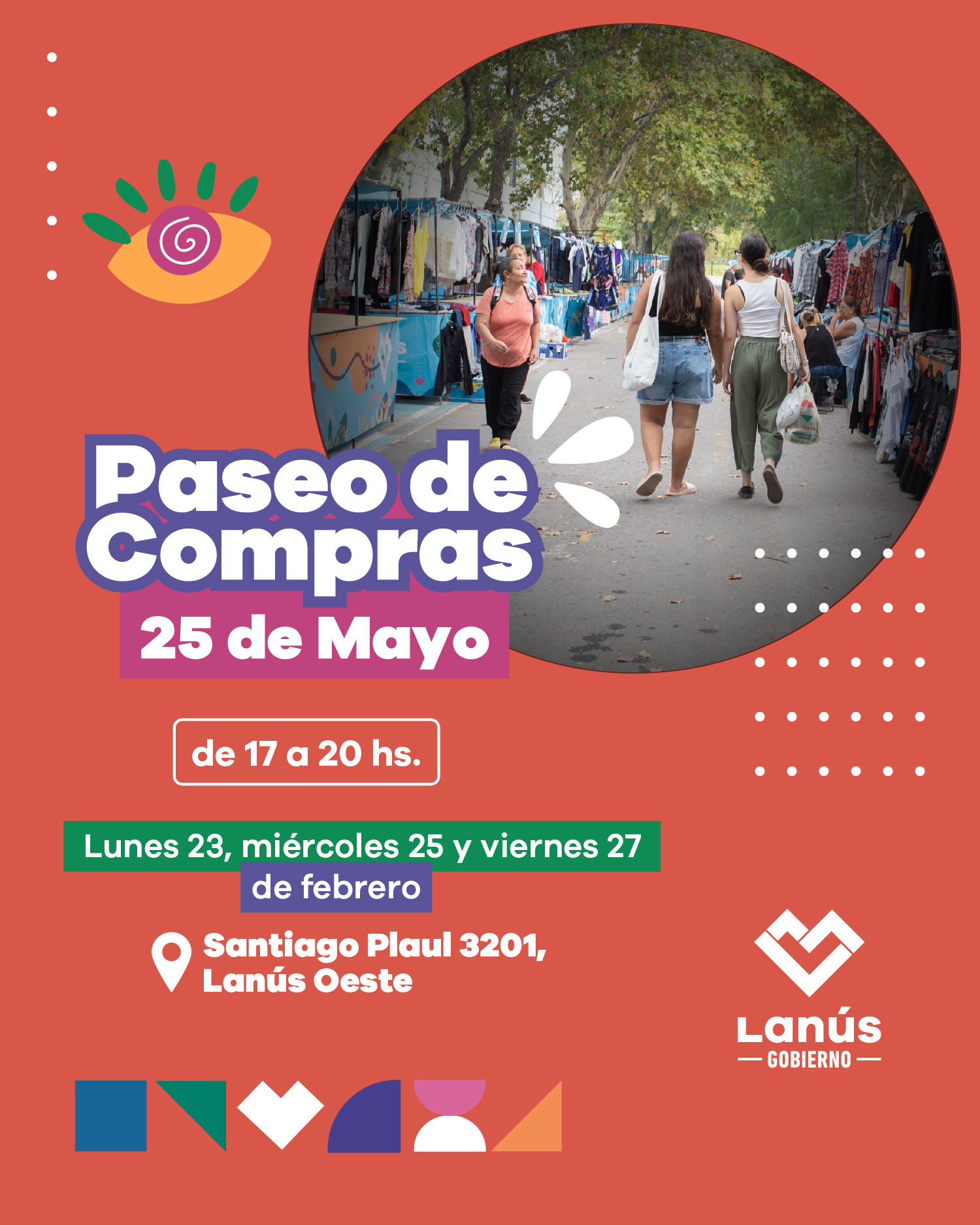 Lanús Gobierno informa que el lunes 23, miércoles 25 y viernes 27 de febrero, de 17 a 20, se llevará a cabo una nueva edición del Paseo de Compras 25 de Mayo, ubicado en Santiago Plaul N° 3201 en Lanús Oeste.
